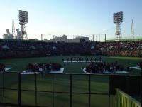 始球式。ピッチャーは平松、キャッチャーは土井、バッターは山本功ニといずれもこの球場に縁の深い方々でした。