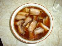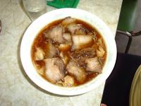 特徴はとにかく黒いスープ。だめな人はだめでしょう、この色は。そして、味のポイントはたまねぎのみじん切りです。このたまねぎが微妙な甘辛さを演出しています。